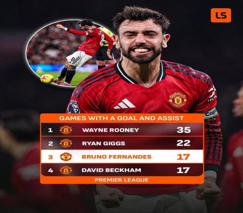 | 英超第16轮,曼联主场4-4战平伯恩茅斯,布鲁诺-费尔南德斯贡献一球一助,至此,布鲁诺-费尔南德斯曼联生涯已有17次英超单场传射建功,队史仅次于鲁尼和吉格斯。